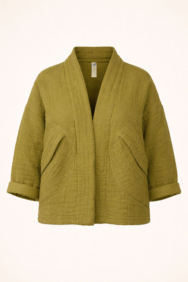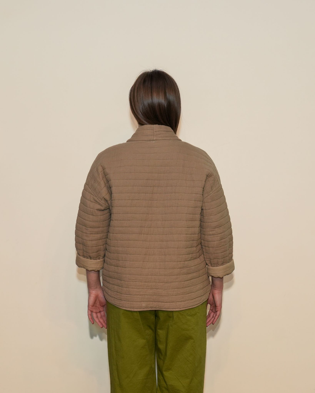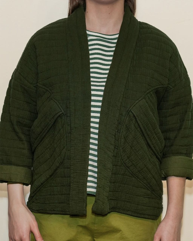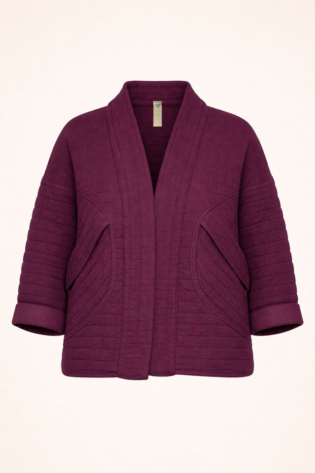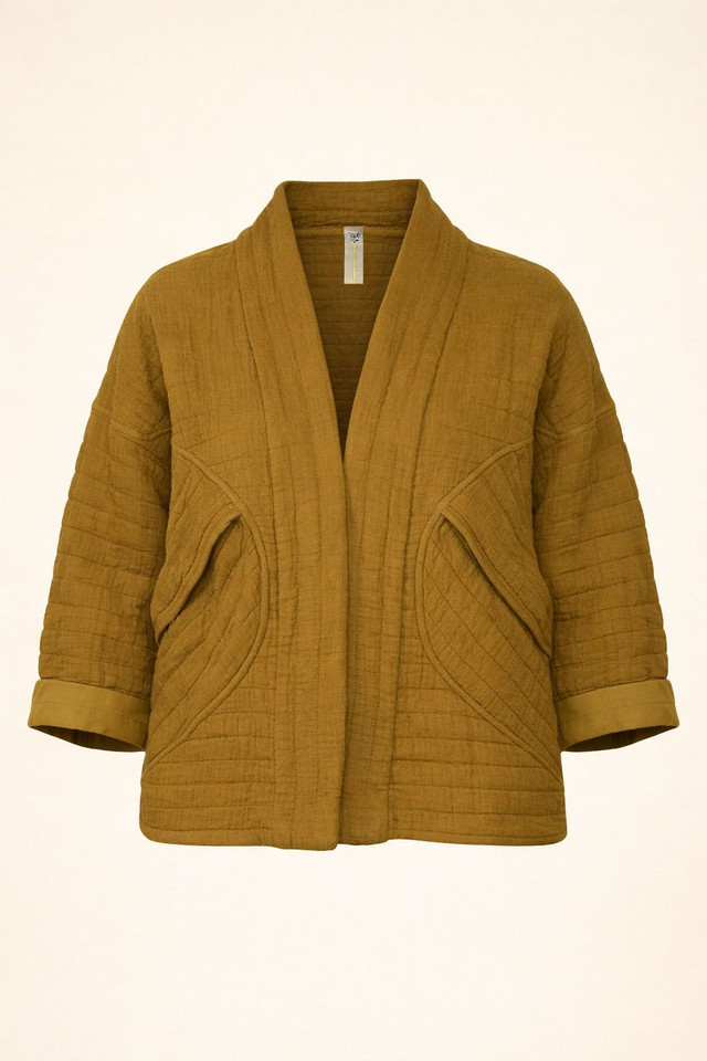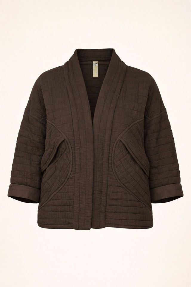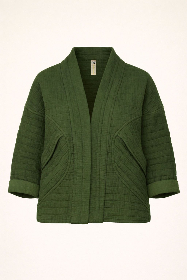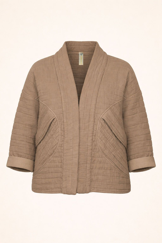 Giacca in tessuto trapuntato 100% cotone, morbida e confortevole, dal taglio corto e rilassato. Il modello presenta linea aperta senza chiusura, manica a tre quarti, due tasche laterali e una lavorazione trapuntata decorativa.