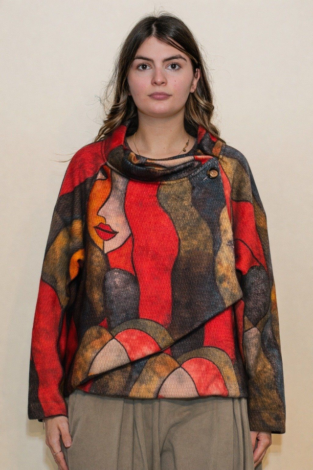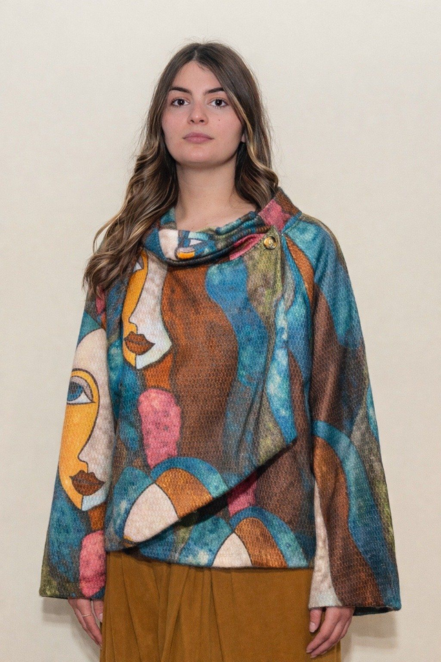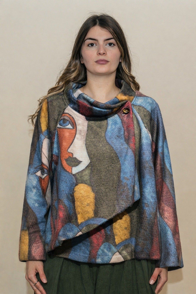 Giacca dal design unico, ispirata all’arte cubista e ai ritratti contemporanei, dove volti stilizzati e geometrie astratte si fondono in una stampa di forte impatto visivo. Un capo che unisce moda e arte.