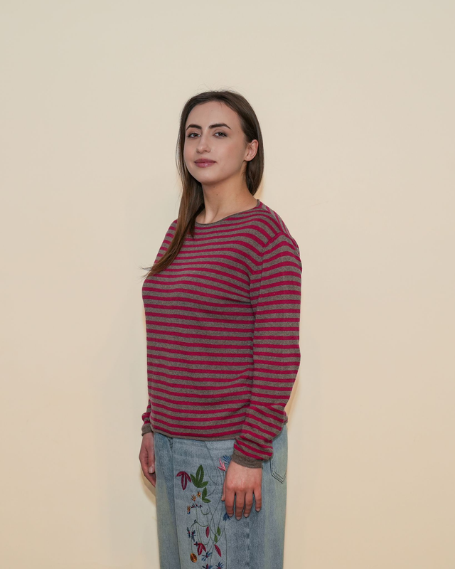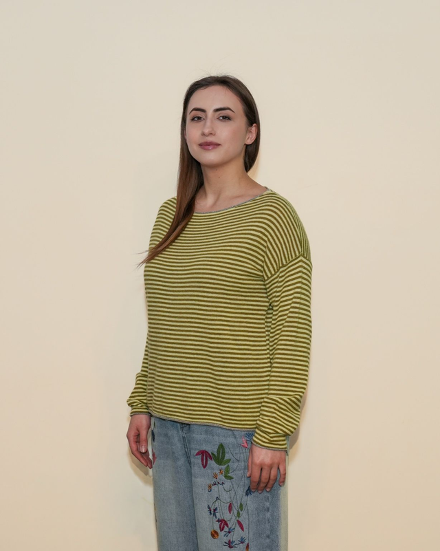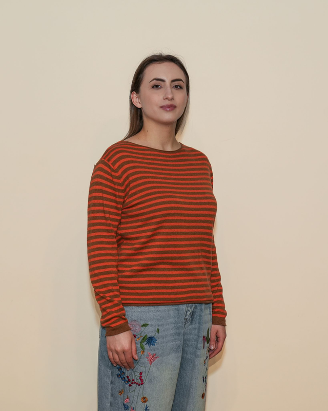Maglione in filo a righe, leggero e confortevole, ideale per le mezze stagioni. Il modello presenta una linea dritta con manica lunga e scollo a barca. Composizione: 35% Viscosa; 30% Poliammide; 30% Lana; 5% Cashmere.