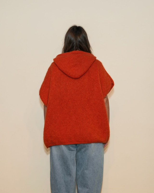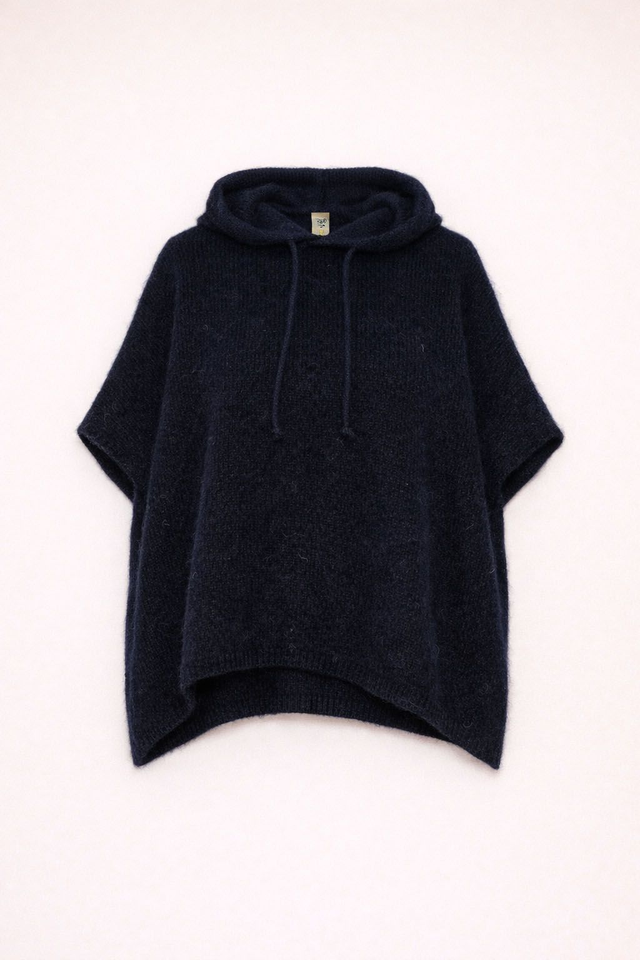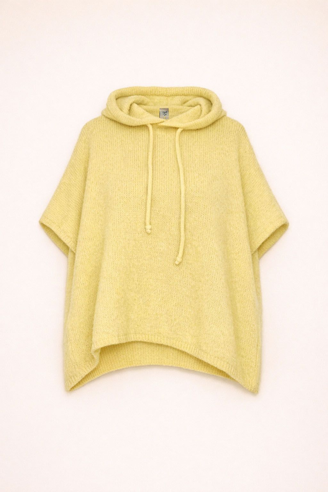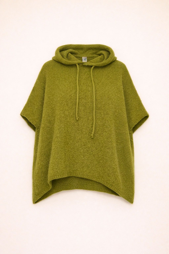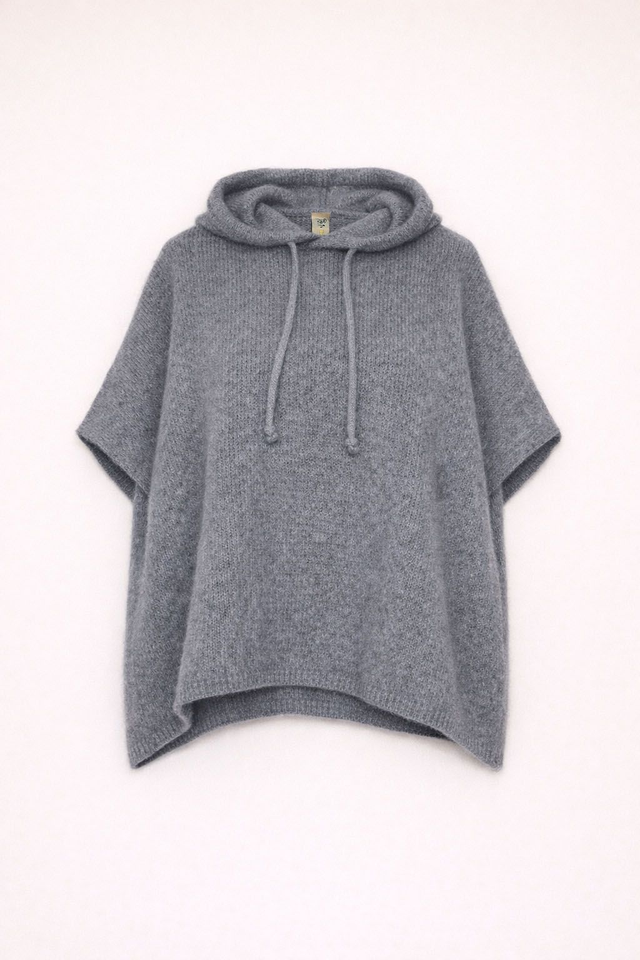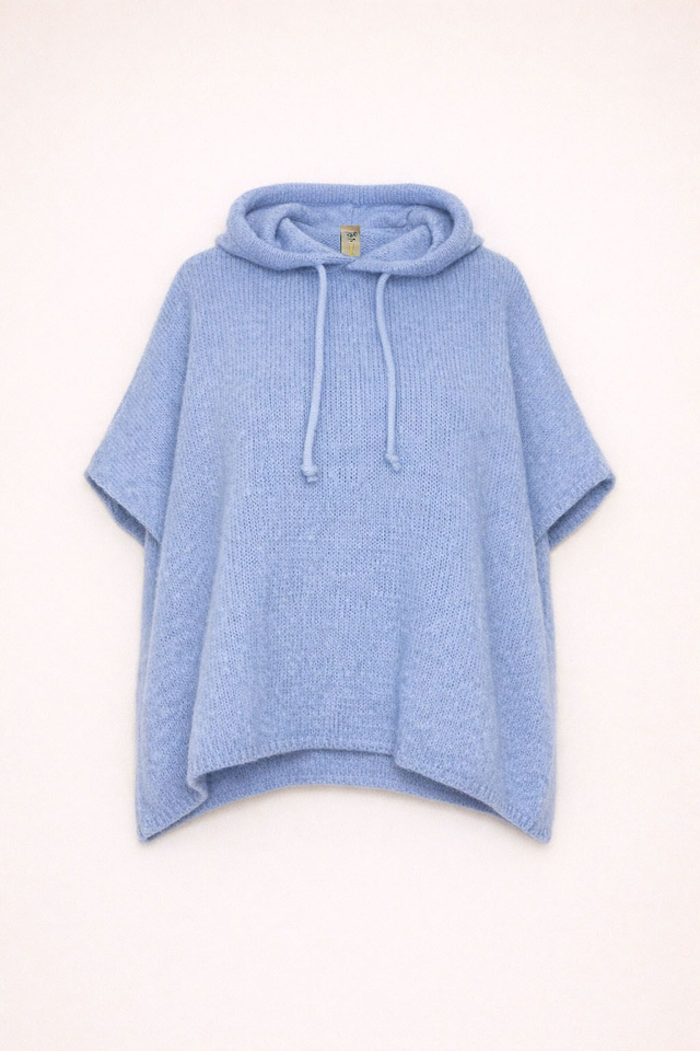 Maglione con cappuccio in maglia, morbido e confortevole, dalla linea ampia e avvolgente. Il modello presenta manica corta, cappuccio con laccetti e taglio asimmetrico sul fondo. Composizione: 40% Mohair; 28% Acrilica; 22% Poliamid; 10% Lana.