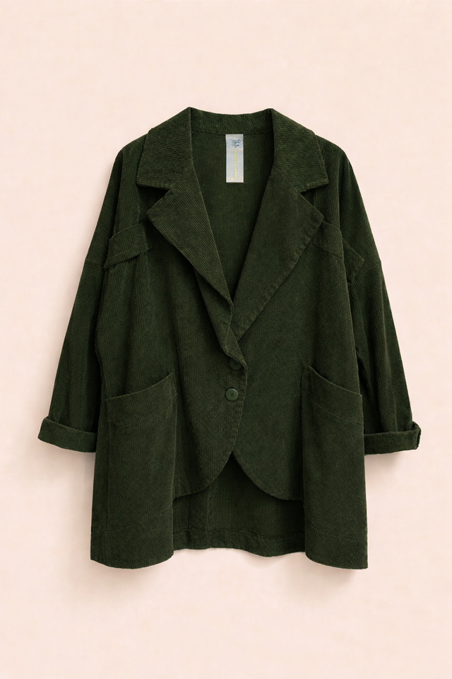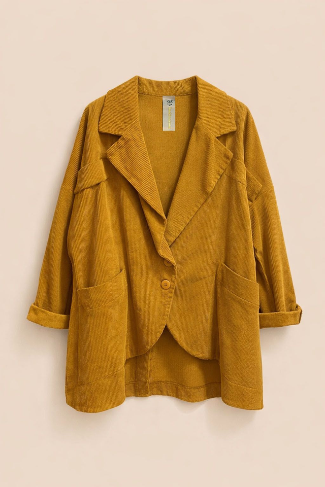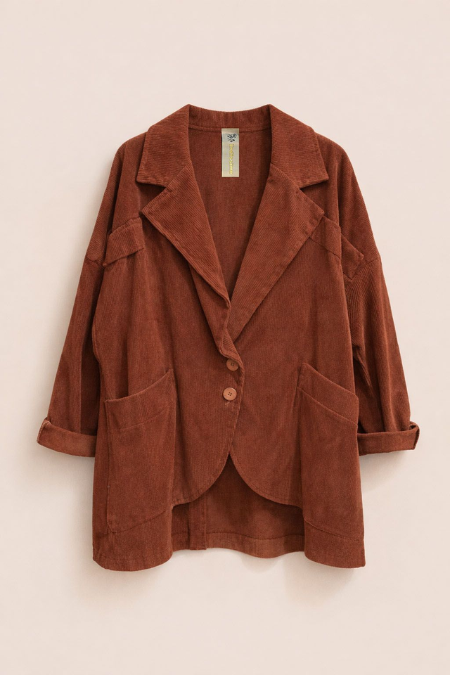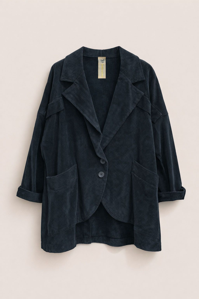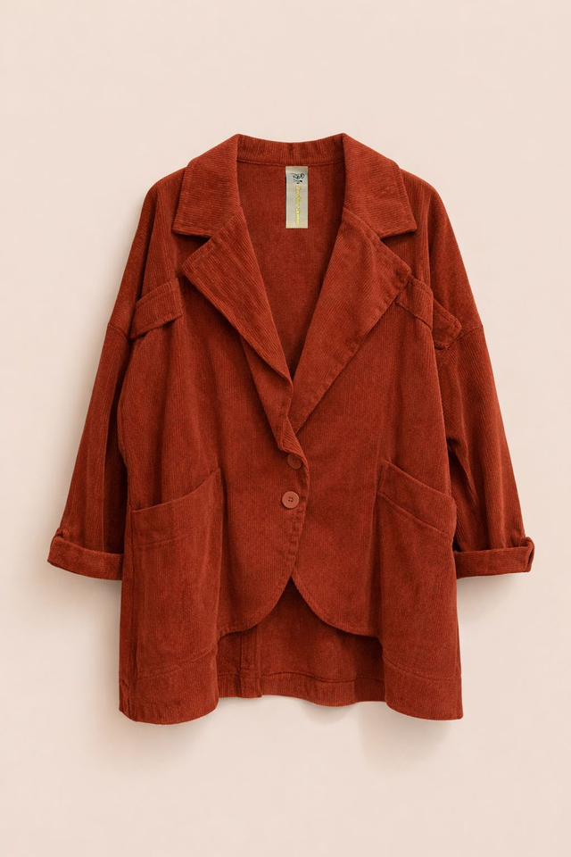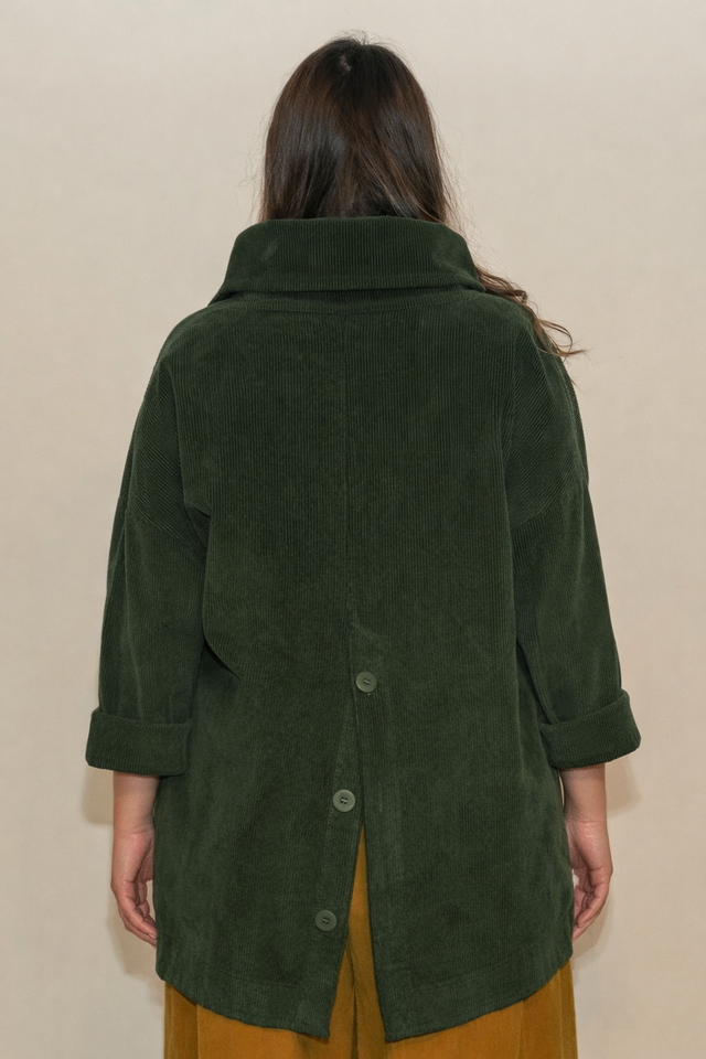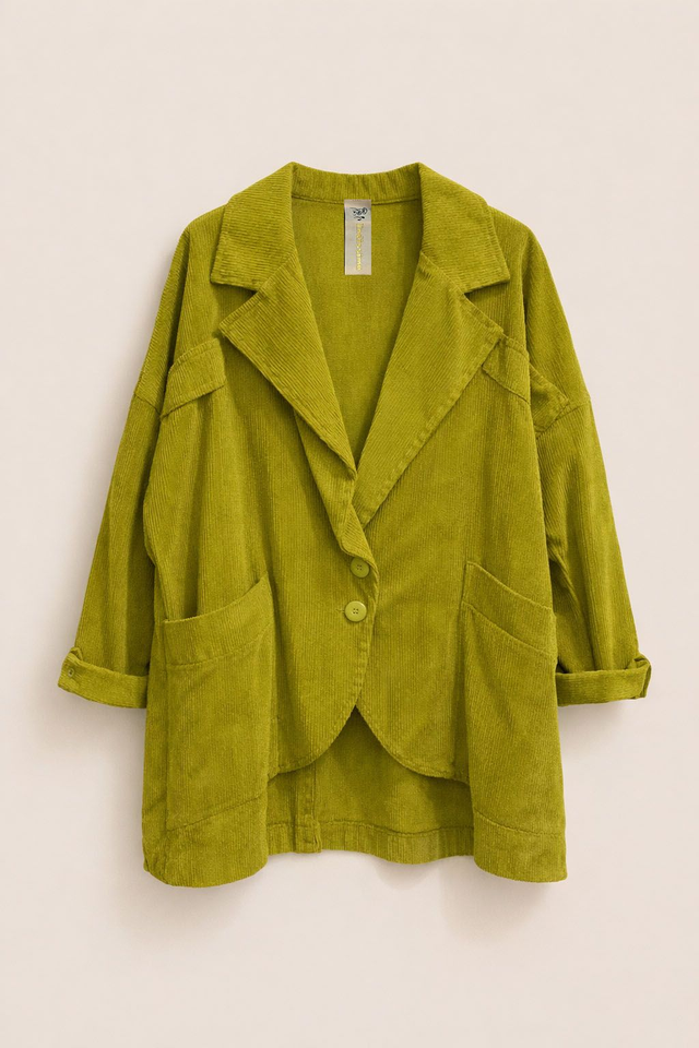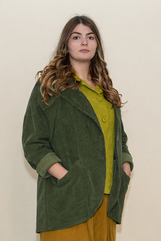 Giacca in velluto 100% cotone, morbida e confortevole, dal taglio dritto e leggermente over. Il modello presenta collo con rever, chiusura con bottoni e ampie tasche frontali.